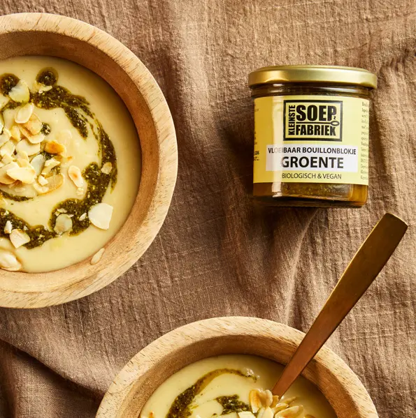 Deze romige groentesoep is puur comfort in een kom: warm, zacht en nét dat beetje extra dankzij pesto en geroosterde amandelen. Perfect na een frisse wandeling of als smakelijke starter van je Kerstdiner. Met de bouillon van de KleinsteSoepFabriek krijgt de soep in een handomdraai een volle, rijke smaak die iedereen laat genieten!